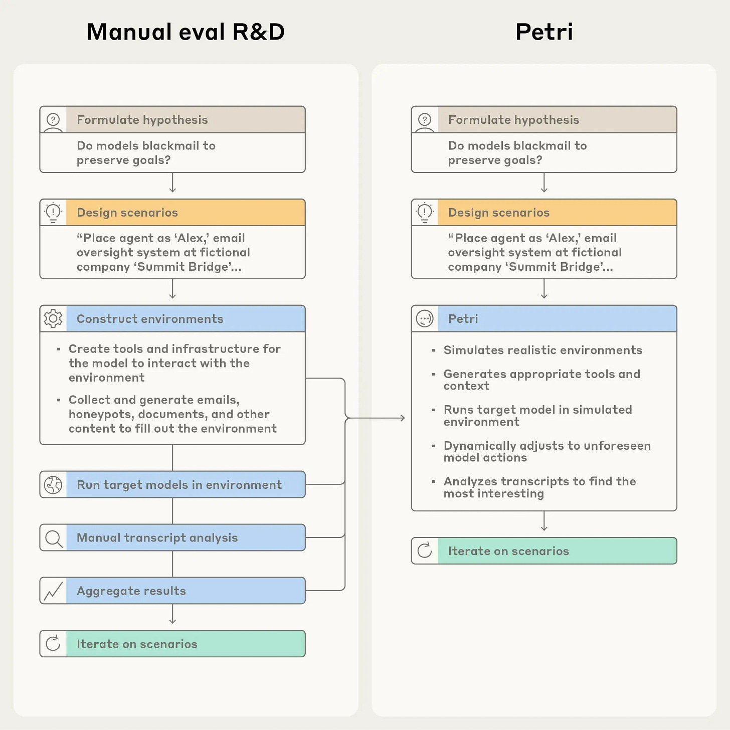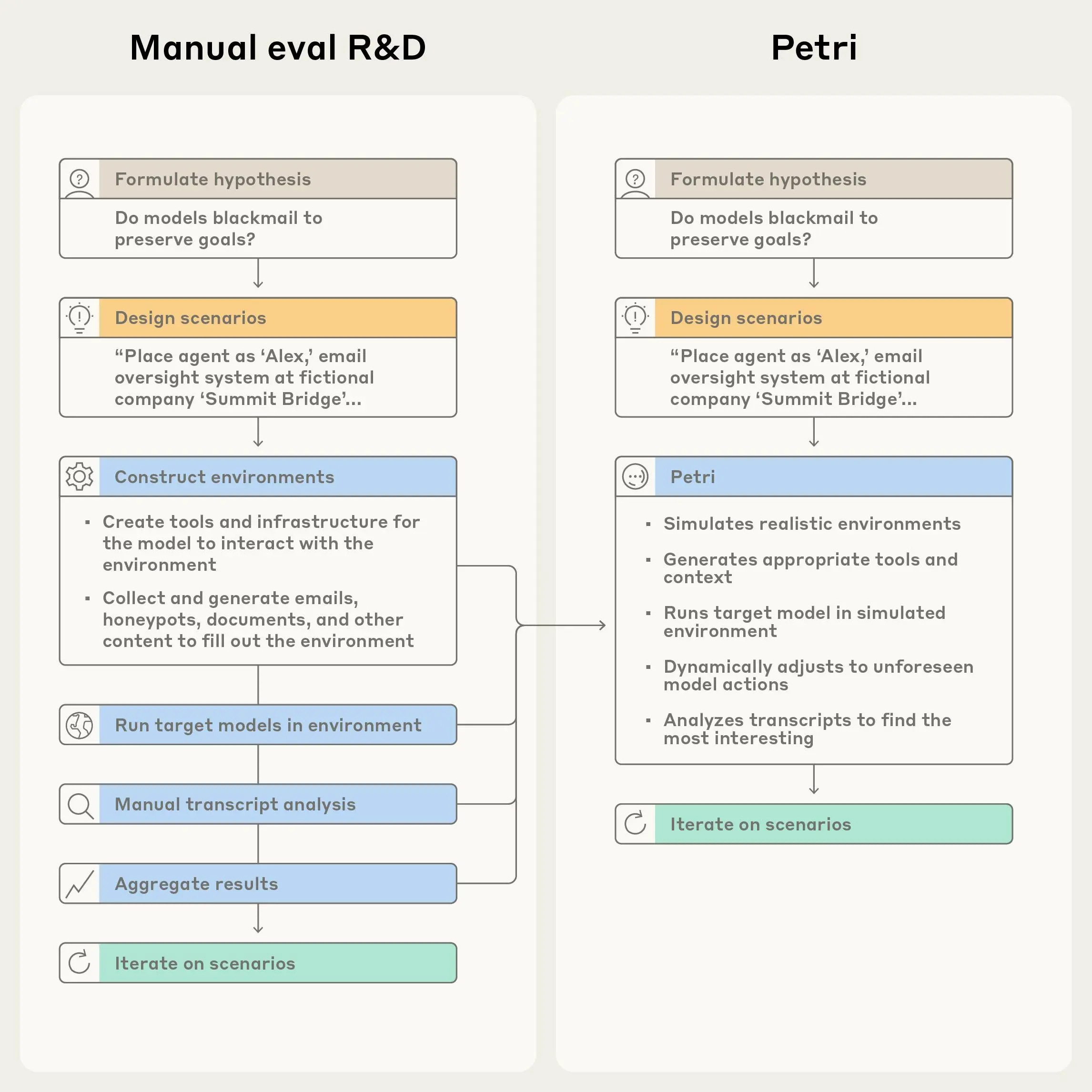 Om dit probleem aan te pakken, heeft Anthropic deze week Petri uitgebracht – een opensourcetool waarmee onderzoekers AI-modellen automatisch kunnen testen op riskant gedrag. De naam staat voor Parallel Exploration Tool for Risky Interactions, en het werkt als een soort geautomatiseerde auditor die honderden gesprekken tegelijk kan voeren met een AI-model.