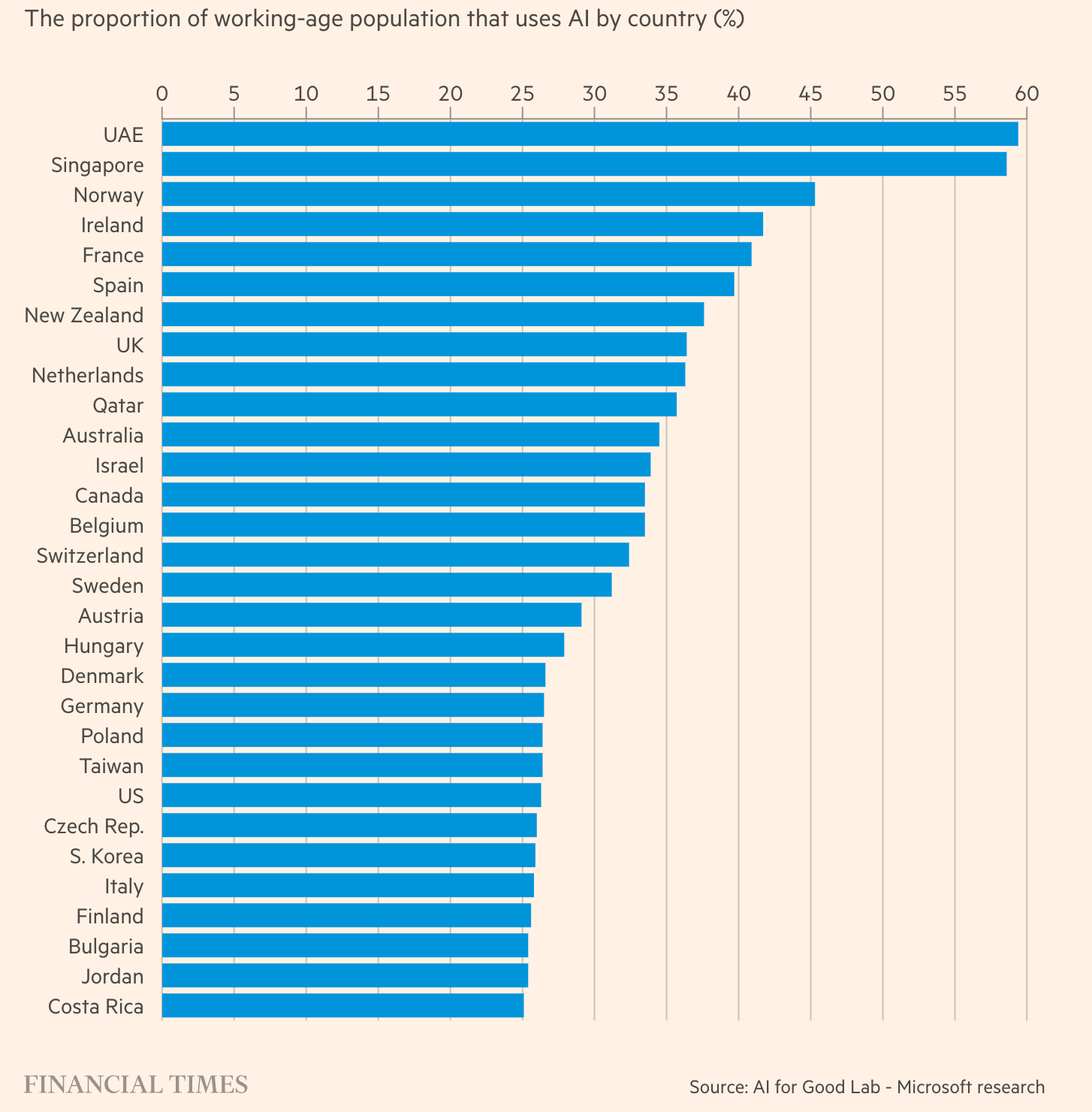 Europa domineert de lijst van hoogste gebruikers, terwijl Zuid-Azië en Afrika bezuiden de Sahara achterblijven. Microsofts AI For Good Lab constateert “een sterke correlatie tussen AI-gebruik en bbp” – rijkere landen gebruiken meer AI.
