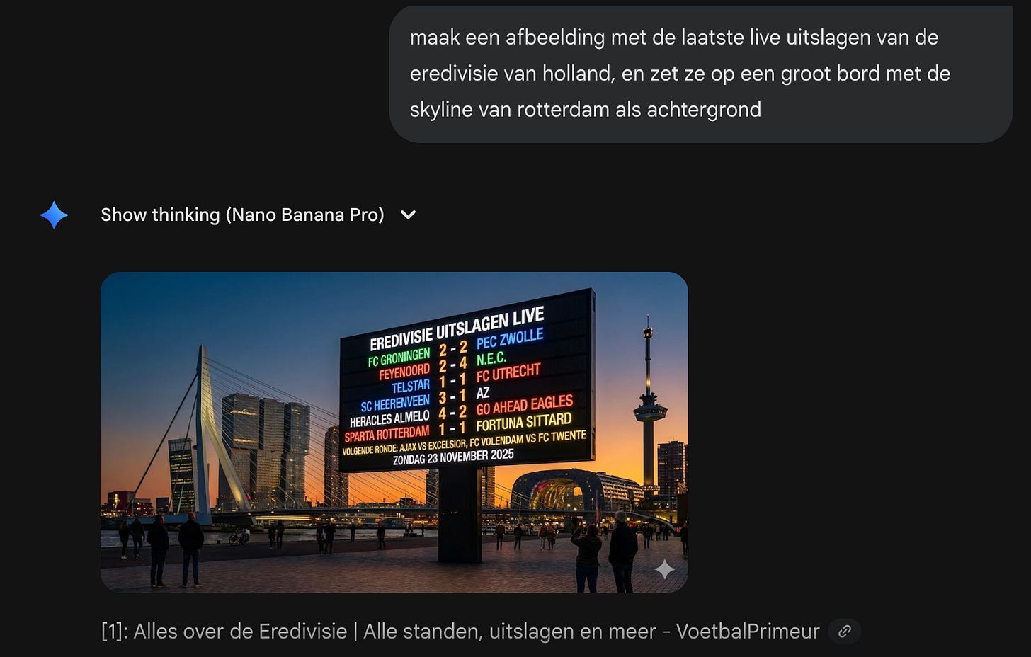 Onze Xiang testte dit met een Nederlandse twist: “Maak een afbeelding met de laatste live uitslagen van de Eredivisie van Holland, en zet ze op een groot bord met de skyline van Rotterdam als achtergrond.”