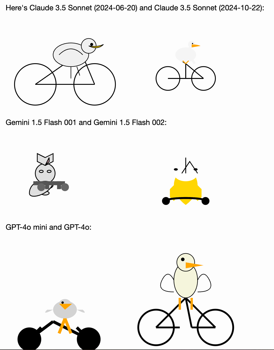 Klinkt simpel, maar er zit een addertje onder het gras. De AI kan het plaatje dat hij maakt namelijk niet zelf zien – hij moet het volledig in code beschrijven, zonder te kunnen controleren of het klopt. Het model moet dus puur op basis van redeneren begrijpen hoe een vogel met zo’n enorme snavel op een tweewieler zou zitten, hoe de poten bij de pedalen komen, en hoe een fietsframe in elkaar steekt.