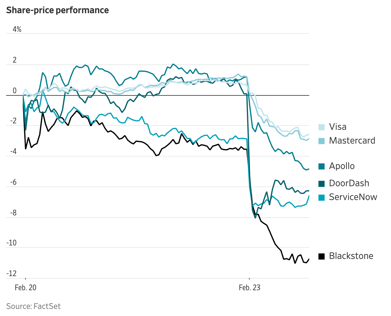 Maandagochtend was het essay het gesprek van de dag op Wall Street. En toen de beurs openging, begon de uitverkoop. IBM daalde 13 procent – de grootste eendaagse val sinds 2000. DoorDash, American Express, Mastercard, Visa, Uber kregen allemaal flinke klappen. De S&P 500 sloot ruim een procent lager.