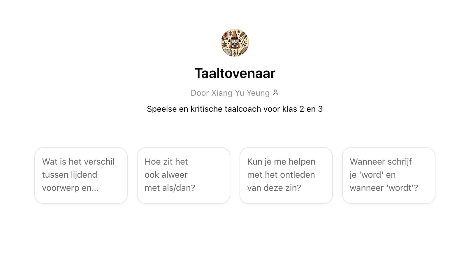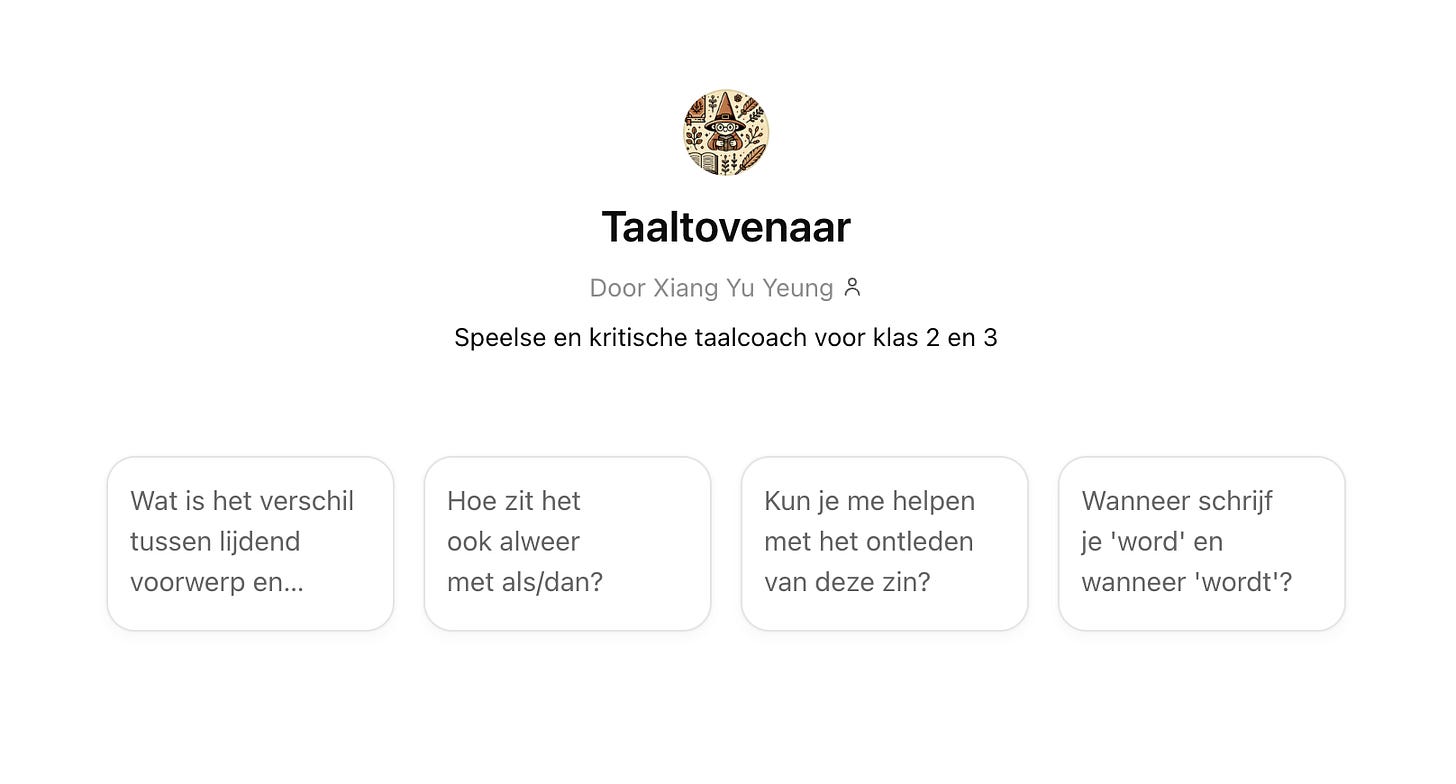 Zo bouwde onze Xiang voor haar tienerzusje een Taaltovenaar - een AI-tutor die haar helpt bij grammatica en spelling, maar nooit persoonlijke informatie vraagt of ongepaste antwoorden geeft. Wil je Taaltovenaar ook gebruiken voor jouw kind? Of leren hoe je zelf een Custom GPT bouwt die perfect aansluit bij de behoeften van jouw kind? Lees dan verder voor een complete handleiding.
