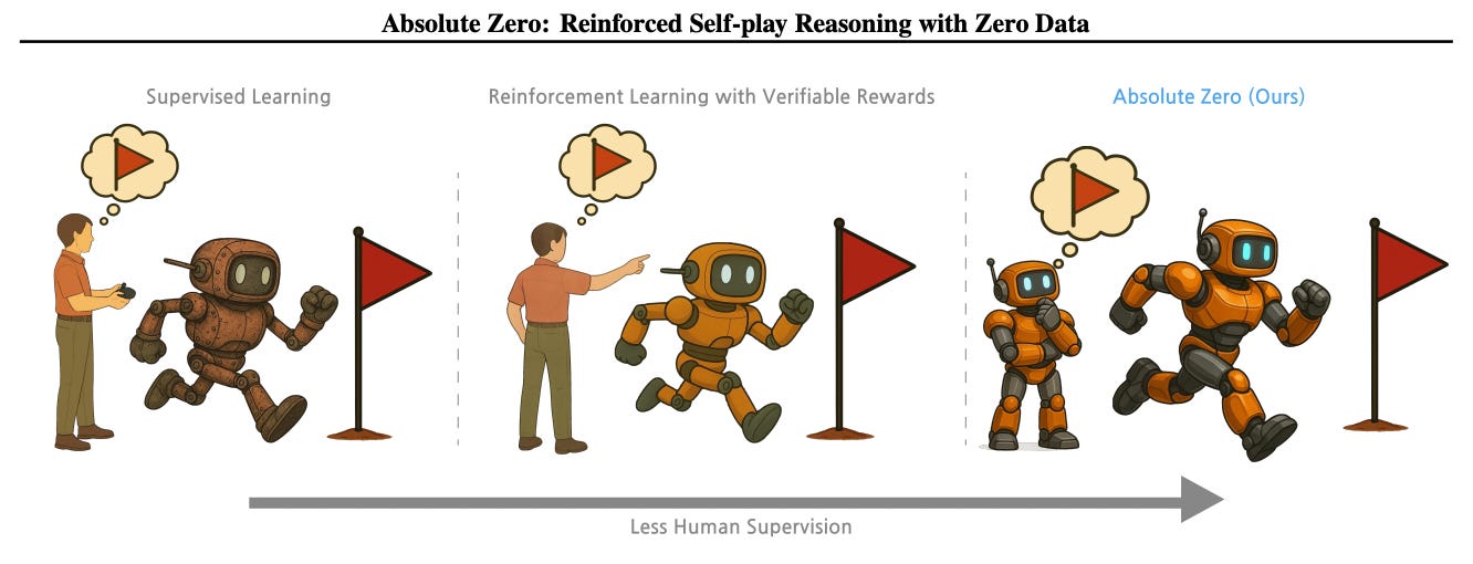 Twee doorbraken uit China bieden mogelijk een uitweg. Absolute Zero, ontwikkeld door Tsinghua University en BIGAI, is een AI-systeem dat zichzelf traint zonder voorbeelden van mensen. Het verzint zijn eigen opdrachten, lost ze op en leert van de resultaten - als een schaakgrootmeester die zichzelf steeds moeilijkere puzzels voorlegt.