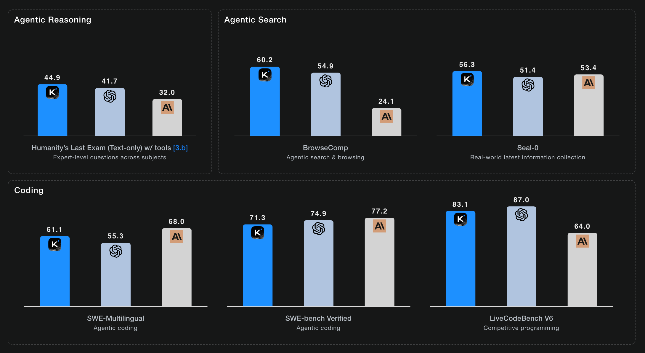 Artificial Analysis, een onafhankelijk testplatform, meldt dat Kimi K2 Thinking 93 procent haalt op de Tau2 Bench Telecom – een benchmark waarbij het model als klantenservicemedewerker moet optreden. Dat is de hoogste score die het heeft gemeten.