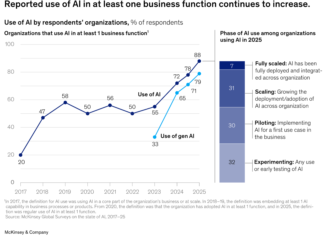 Dat is de paradox die uit McKinseys State of AI 2025 rapport naar voren komt. Van de bijna 2000 ondervraagde leidinggevenden in 105 landen zegt 88 procent dat hun organisatie AI gebruikt in minstens één bedrijfsonderdeel. Dat is een forse stijging ten opzichte van de 78 procent van vorig jaar. Je zou denken: mooi, AI is overal.