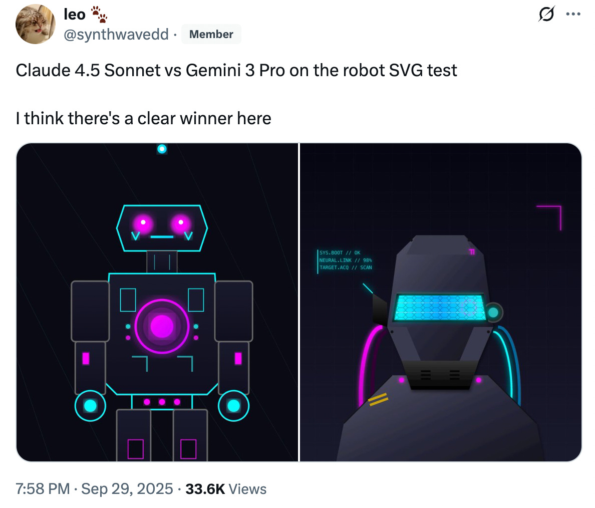 Google test Gemini 3 achter de schermen, lancering verwacht op 9 oktober. Vroege testers op AI Studio zien Gemini 3 al langskomen, en de eerste resultaten zijn veelbelovend. Het nieuwe model presteert vooral opvallend goed bij het genereren van SVG’s – traditioneel een goede indicator voor codingvaardigheden. Volgens de geruchten zou Gemini 3 zelfs Anthropics Sonnet 4.5 voorbijstreven op technische taken. Google lijkt ook te werken aan een vernieuwde versie van Veo en een Agent Mode met browserbesturing, waarmee je de AI opdrachten kunt geven om acties in je browser uit te voeren. Voor developers en early adopters wordt het een interessante week.