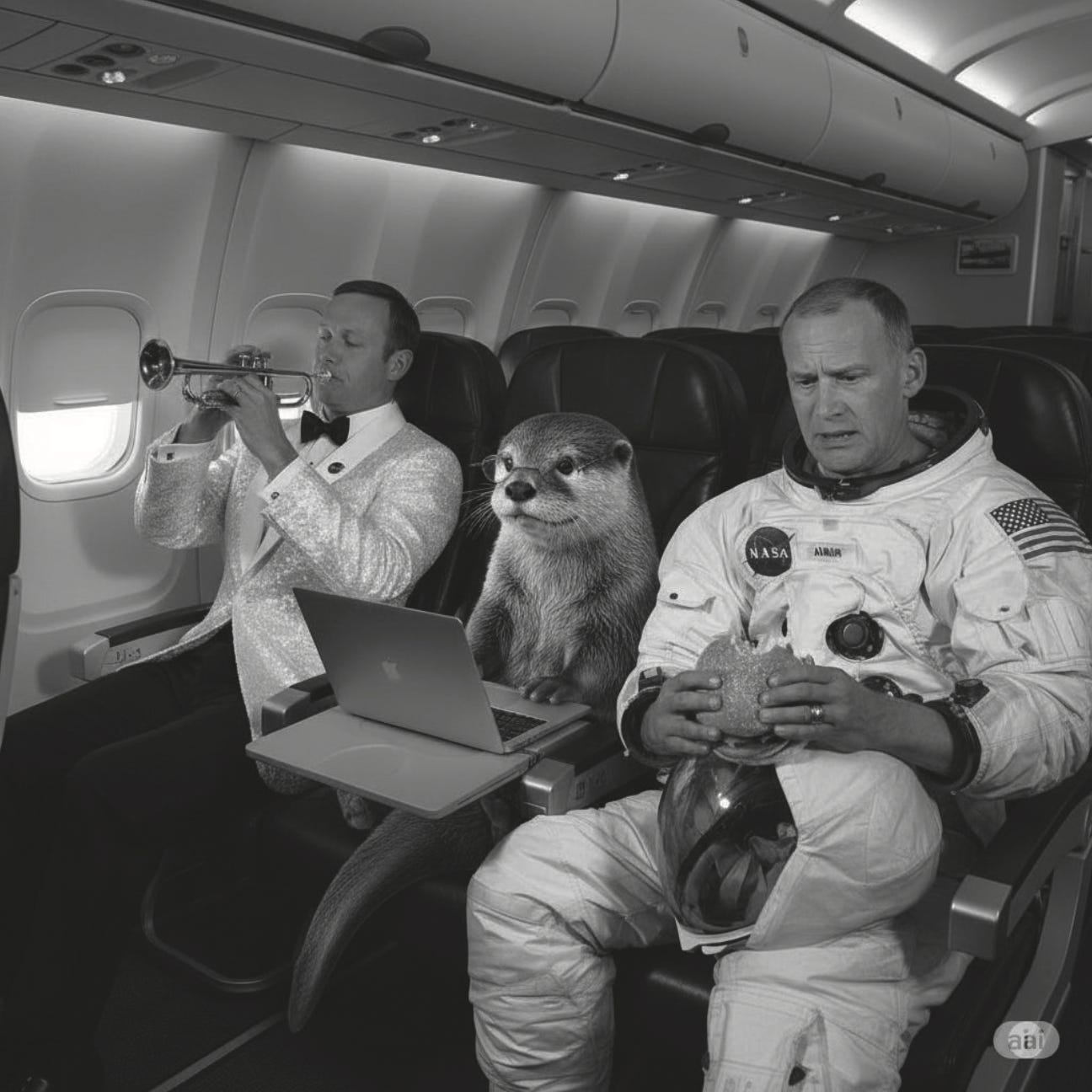 We kunnen een stapje verder gaan: toon me nu een foto waarop Neil Armstrong en Buzz Aldrin, in dezelfde outfits, op hun stoel zitten in een modern vliegtuig, Neil oogt ontspannen, en leunt achterover terwijl hij trompet speelt, Buzz lijkt nerveus en houdt een hamburger vast, op de middelste stoel zit een realistische otter op een stoel die een laptop gebruikt.