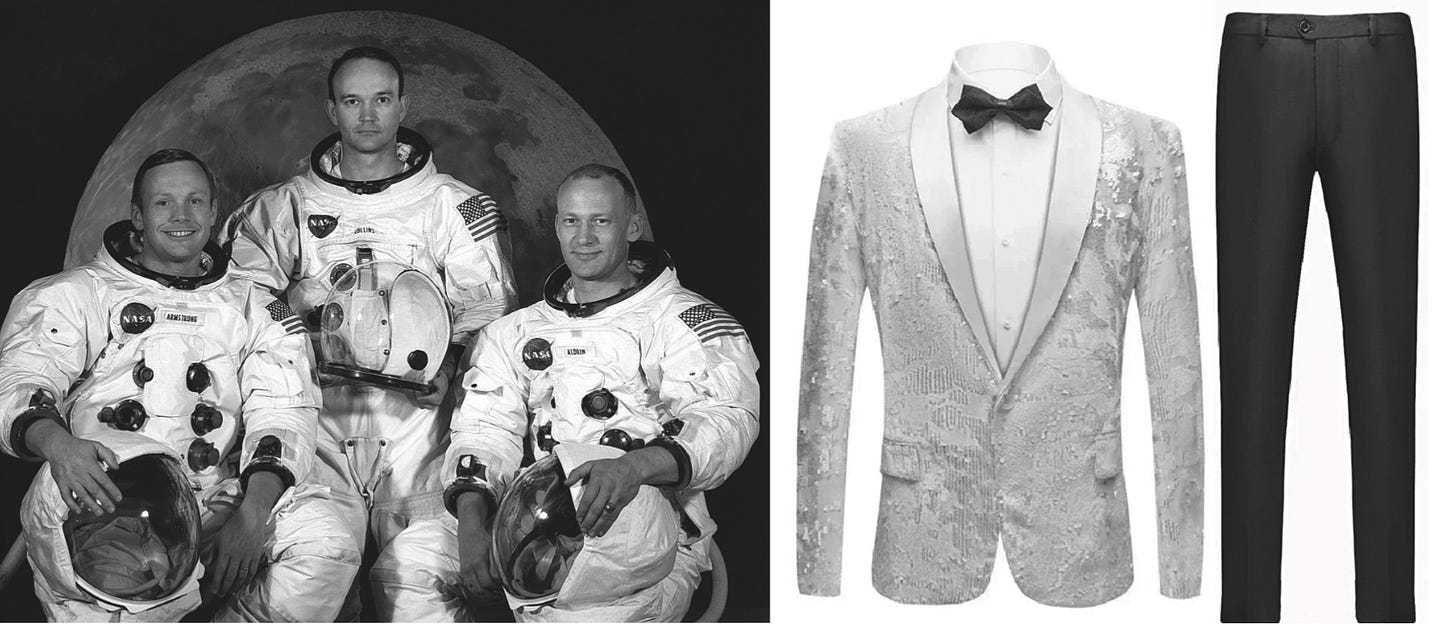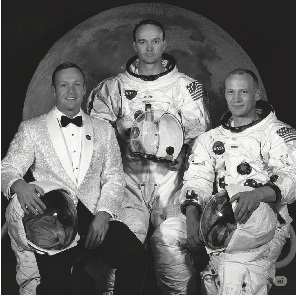 Om een voorbeeld te geven van zowel de kracht als het gebruiksgemak, uploadde ik een iconische (en rechtenvrije) foto van de astronauten van de Apollo 11 en een willekeurig plaatje van een glinsterende smoking en gaf het afbeeldingenmodel de doodsimpele prompt: trek Neil Armstrong op links deze smoking aan.