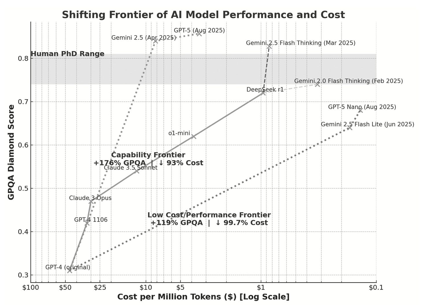 Die verandering is deels te danken aan het feit dat slimmere modellen ontzettend veel efficiënter draaien. De capaciteiten van AI zijn uitgezet op de y-as, en de logaritmisch dalende kosten op de x-as. Toen GPT-4 uitkwam, kostte het ongeveer 50 dollar om met een miljoen tokens te werken (een token is ruwweg één woord). Nu kost het ongeveer 14 dollarcent per miljoen tokens om GPT-5 nano te gebruiken, een veel capabeler model dan de oorspronkelijke GPT-4.